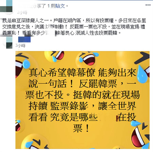 不過,有深綠人士看不下去,在facebook上貼文表示,“我是麻豆深綠癡人之一。戶籍在湖內區,所以有投票權,多日來在各里交換意見之后,決議:以靜制動!反罷票一票也不投,并在現場宣揚禮義廉恥!看看有多少XX昧著良心、泯滅人性去投票罷韓”。其他網友也大贊該網友的舉動。(中國臺灣網 李寧)