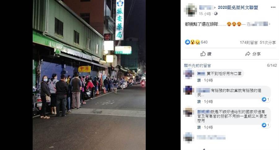 但是網友在臉書上貼出一張圖,表示三更半夜還有民眾在藥店外大排長龍,等著要購買口罩,怒批民進黨當局睜眼說瞎話,不要再自欺欺人了!更痛批民進黨每個星期還送10萬片口罩到美國,根本就是在罔顧臺灣民眾的健康!