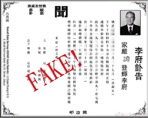 李登輝病逝訃告驚現(xiàn)網(wǎng)絡(luò) 臺(tái)灣調(diào)查部門表示為假消息呼吁勿轉(zhuǎn)發(fā)