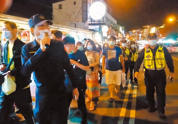 對于墾丁街上人潮摩肩擦踵,警方在大街上兵分兩路,步行及開著巡邏車沿街廣播,提醒民眾“保持社交距離”。(中國臺灣網 李寧)