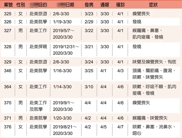 臺灣地區流行疫情指揮中心指揮官陳時中表示,案376于4月2日至5日陸續出現咳嗽、鼻塞、流鼻水及惡心癥狀,由衛生單位安排就醫采檢,于今日確診。案376為案370的友人,于美國就學,3月30日與案370、371一同返臺,居家檢疫期間因返臺搭乘的班機上有其他旅客確診,因此改列為居家隔離接觸者。
