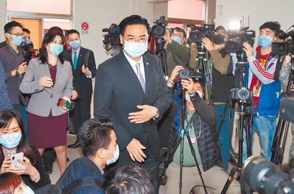 民進(jìn)黨當(dāng)局外事主管部門負(fù)責(zé)人吳釗燮(中)。(圖片來源:臺灣“中時電子報”)