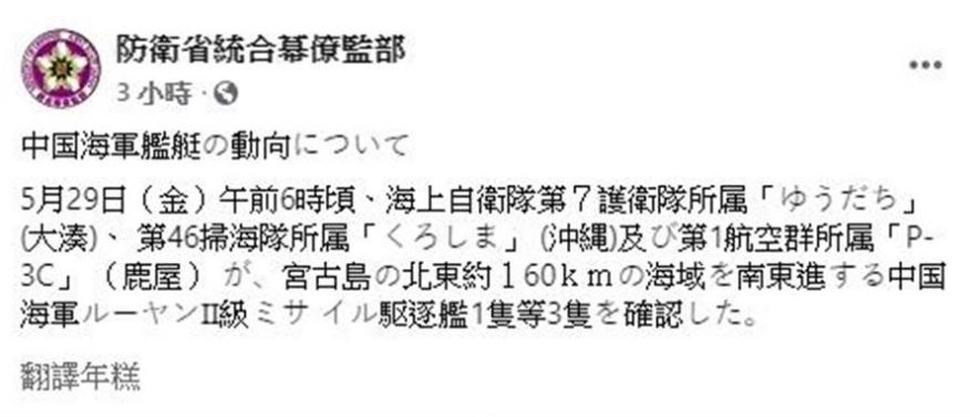 中國臺灣網5月30日訊 臺灣“中時電子報”援引日本防衛省統合幕僚監部消息稱,日本時間29日上午6點,日本海上自衛隊在宮古島東北方160公里海域,發現正在朝東南向航行的3艘解放軍海軍軍艦,軍艦自沖繩與宮古島之間的宮古海峽向南航行,并進入太平洋。臺當局防務主管部門對此聲稱,目前一切狀況正常。