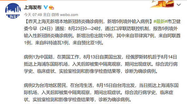 中國臺灣網(wǎng)8月24日訊 繼8月18日后,上海市24日再度通報(bào)新增臺灣地區(qū)輸入確診病例。據(jù)上海市政府新聞辦公室官方微博帳號“上海發(fā)布”消息,上海市衛(wèi)健委24日早上通報(bào):8月23日0—24時(shí),通過口岸聯(lián)防聯(lián)控機(jī)制,報(bào)告5例境外輸入性新冠肺炎確診病例,其中1例為臺灣地區(qū)輸入病例。