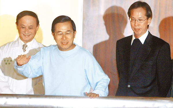 圖為2005年陳水扁(中)在黃芳彥(右)陪同下赴臺大健檢。(圖片來源:臺灣“中時新聞網(wǎng)”)