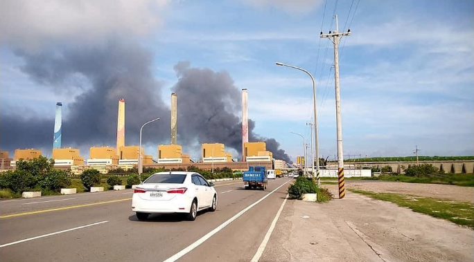臺中火力發電廠疑似輸送帶起火 消防隊搶救中。(圖片來自臺媒)