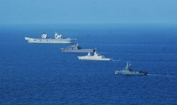 圖為英國(guó)“伊麗莎白女王”號(hào)與新加坡海軍進(jìn)行會(huì)合演習(xí)。