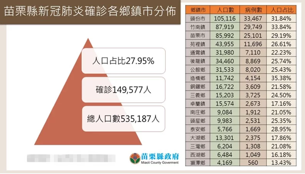 苗栗縣今天新增1155例,今年迄今累計本地病例149577人,人口占比確診率達27.95%。(圖片取自臺媒)