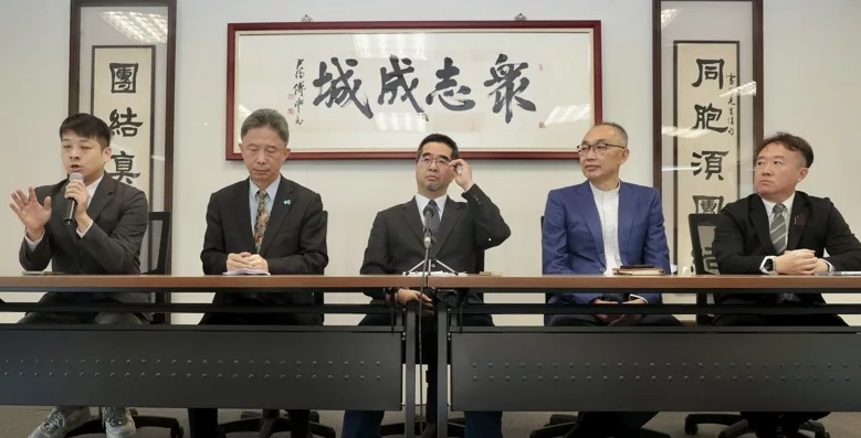 馬英九基金會執行長蕭旭岑(中)主持記者會,公布藍白雙方對2024臺灣地區領導人選舉正副人選搭配暫時“無共識”。(圖片來源:臺媒)