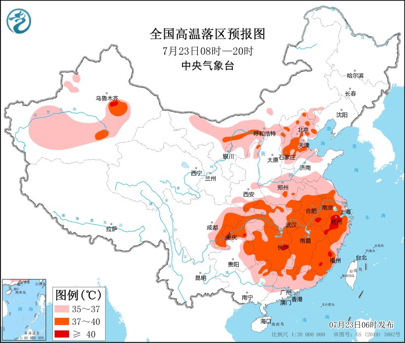 全國高溫落區(qū)預(yù)報圖(7月23日08時-20時)
