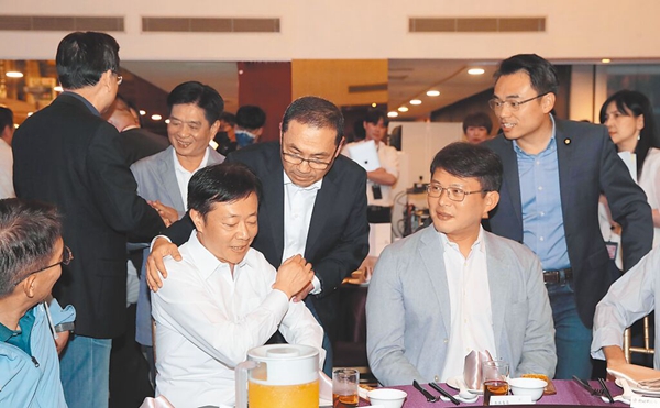 新北市長侯友宜(中)日前邀請新北市區域與不分區民代餐敘,拜托協助新北爭取各項重大建設,民進黨民代張宏陸(左三)、民眾黨民代黃國昌(右二)、國民黨民代洪孟楷(右)與新北市副市長劉和然(左)都出席。(圖片來源:臺灣“中時新聞網”)