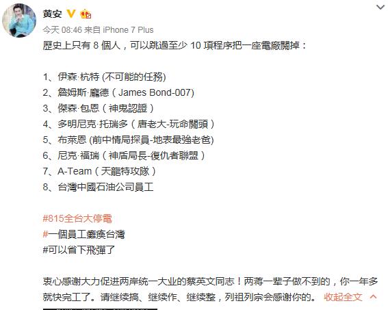 “815全臺停電”事件也引發了不少臺灣演藝界人士的關注。