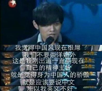 比如,2008年11月風尚大典時,主持人曾寶儀提到讓在韓國人氣很高的周杰倫用韓語感謝韓國歌迷時,他說:中國風很屌,大家都要來學中文,我們不要崇洋媚外,這是我剛出道一直到現(xiàn)在的宗旨。