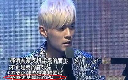 再比如,周杰倫在2012年4月全球華語榜中榜頒獎典禮上領獎時說“希望所有的歌手可以團結起來,因為華人的音樂是最屌的”;同年12月的百度沸點慶典上,狂攬3項年度大獎的周董依舊不改力挺民族文化的本色,公開“叫囂”韓流:“不要讓韓流越來越囂張,華流才是最屌的。”