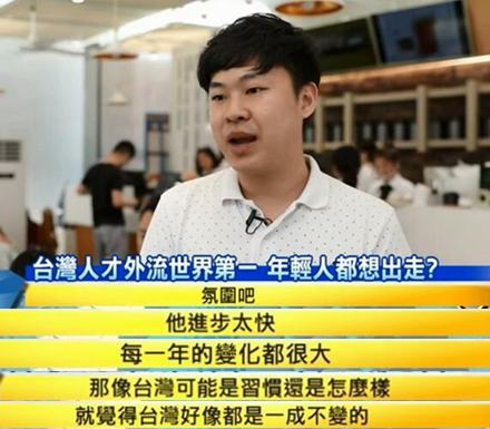 臺當局還有一項統計的數據顯示,到2015年,在約有1000萬人的臺灣勞動力中,超過72萬人的目光不再局限于臺灣,將找尋更好工作機會的目標看向了大陸以及其他國家,其中更有72.5%的人擁有大學以上學歷,他們中有的說在臺灣工作看不到機會和未來: