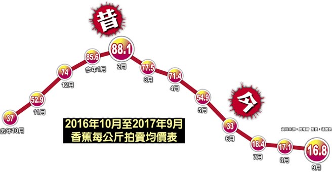 2016年10月至2017年9月臺灣香蕉每公斤拍賣均價表(單位:新臺幣;圖片來源:臺灣《聯合報》)