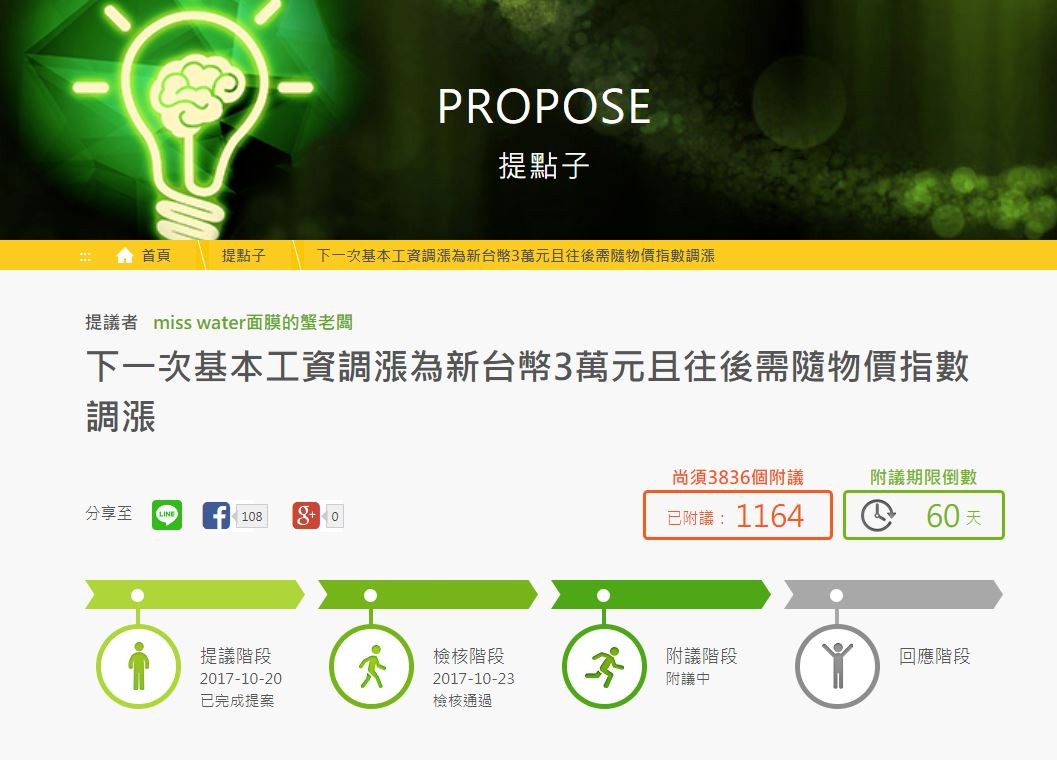 臺灣一家面膜公司的老板20日在“公共政策網(wǎng)絡(luò)參與平臺”提議,要求“下一次基本工資調(diào)漲為3萬元且往后需隨物價指數(shù)調(diào)漲”。若該提案能得到5000網(wǎng)友附議的話,臺“勞動部”便會依相關(guān)程序回應(yīng)喲。