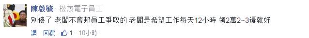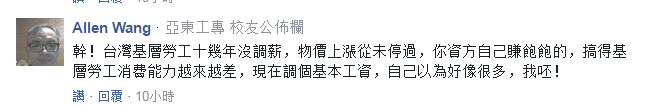更針對“物價上漲”的質(zhì)疑直言道,臺灣勞工心態(tài)很奇怪,討論著基本工資漲到3萬物價會調(diào)漲,但這根本不是勞工該煩惱的部分,“因為物價的調(diào)漲不是你能干預(yù)的,有能力漲價的只有資方。”還說,既然勞工只能被動接受資方漲價,那現(xiàn)在擔(dān)心這些有何意義?從“油電雙漲”到“一例一休”,物價漲了不少,“你的薪資漲了嗎”?