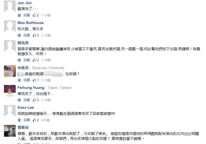 據臺灣《中時電子報》報道,黃國昌稍早時還在臉譜網(facebook)表示,“很久很久沒有如此難過”,不是因為全身濕冷、不是因為超過40小時未進食、而是因為本來以為2016改變已經發生,“沒有想到我所熱愛的臺灣權柄的濫用,竟然依舊如此冷酷”;而當警方不斷柔性勸導其早點“離開休息”時,他又反唇相譏“你不要再演戲了”!