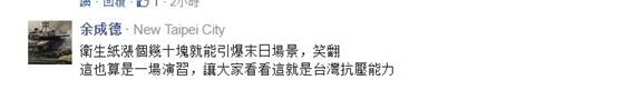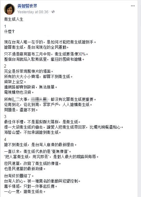 臺灣政論節(jié)目主持人黃智賢則發(fā)文說,所有大事,都沒有比買衛(wèi)生紙更重要,而“搶不到衛(wèi)生紙,是臺灣人崩潰的最新理由”;更嘲諷道,一直以來衛(wèi)生紙代表的是“毫無價值”,但民進(jìn)黨改寫了衛(wèi)生紙的價值,這“也是民進(jìn)黨的最新政績”了。