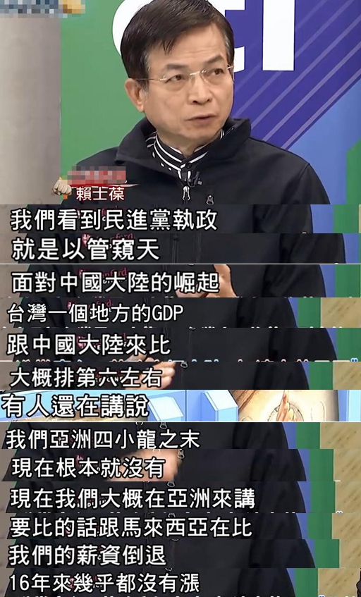 民代賴士葆就指出,臺灣薪資已經(jīng)16年幾乎沒漲過,而在民進黨執(zhí)政后更用“以管窺天”的心態(tài)因應世界大趨勢,“有人說我們是‘亞洲四小龍’之末,現(xiàn)在根本就沒有”。他更強調(diào),如今大陸已經(jīng)崛起了,而臺灣的GDP在大陸只能排第六或第七而已;黃智賢也直言,人家那“三小龍”并不承認臺灣是第四小龍,“叫做臺灣是一條蟲”……