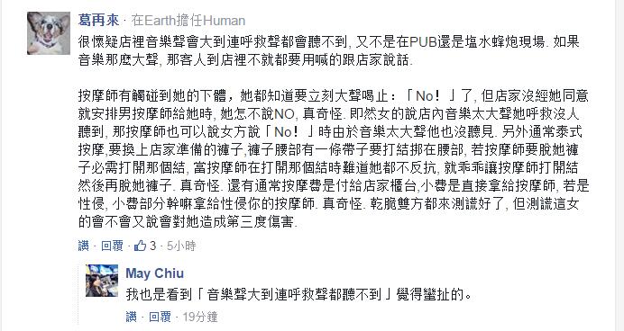 “他直接把我褲子脫掉就性侵我”,身為被害人的臺(tái)女在接受臺(tái)灣《東森新聞》訪(fǎng)問(wèn)卻表示,她被按摩到一半就慘遭性侵,且店內(nèi)音樂(lè)大聲,她的呼救完全沒(méi)人知道,還稱(chēng)付錢(qián)給小費(fèi)只是單純想快點(diǎn)離開(kāi),“(他說(shuō))我給他小費(fèi),是因?yàn)槲覞M(mǎn)意他服務(wù),這我不能接受”。