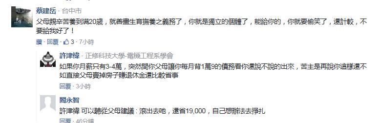 該網(wǎng)友稱(chēng)父母將一棟透天厝過(guò)戶(hù)給自己與哥哥后,竟然還背著兄弟倆用房子向銀行貸款550萬(wàn)元(新臺(tái)幣,下同)當(dāng)作退休金,并讓兩兄弟每月一人得各自負(fù)擔(dān)1萬(wàn)9000元的貸款,自感被家人坑了的他無(wú)奈崩潰大嘆:“天底下有這么白目的父母嗎?”