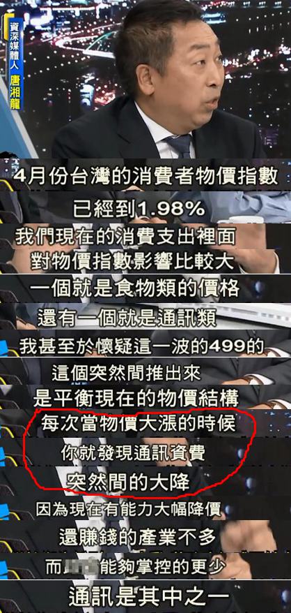 但臺灣資深媒體人唐湘龍有“不同見解”,他質疑怎們每次物價上漲的時候通訊費就會突然下降呢?為此唐直言,很是懷疑這個突然推出來的“499方案”就是臺當局用來“平衡現在物價結構”的。