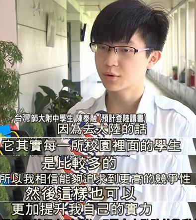 “除了一流大學外,不少學生還一口氣申請了5、6所大陸大學”,桃園市復旦高中校長段臺民說,就算是大陸2、3線的大學,學生也都會申請,根本就是“吃了秤鉈鐵了心”的要到大陸念書;武陵校長林清波也以校內一名程度“優秀”的學生為例,指就算已獲保送臺大資格,但這名學生仍決定考學測以申請北京大學元培學院,而該學生的哥哥去年就已到北京清華大學念書了。