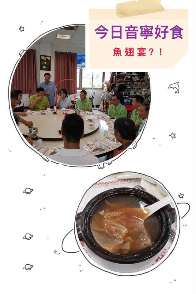 游淑慧在臉書上po出吳音寧坐在餐廳圓桌與大家聊天及魚翅料理的照片,照片上并打出“今日的音寧好食魚翅宴”。