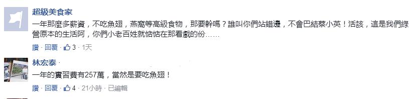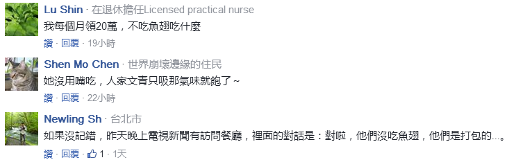 她表示,5月9日吳音寧還在臉譜網大談,北農的基層有多么辛苦,所以為北農加薪!5月11日,她就在高雄吃魚翅。蔡英文吃法國料理挨轟、李應元吃魚翅道歉,比起他們的小老妹日子爽爽過,其實還真冤枉了。