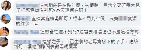 對(duì)此,網(wǎng)友痛批:“法官腦袋是裝什么,被懷胎十月含辛茹苦養(yǎng)大兒子打死竟然沒(méi)判死?天理何在!”“根本不用判勞役,浪費(fèi)資源的家伙”“法官要積陰德也不是這種方式”“這種逆子應(yīng)該判死,讓他到陰間對(duì)母親贖罪”。