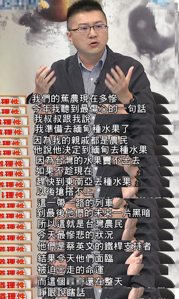 那么,究竟臺灣民眾現在到底有多慘?近期,懵妹在一檔政論節目中看到臺灣嘉賓是這樣說的:“因為臺灣的水果賣不出去,我叔叔要到緬甸種水果,以后搶搭不上‘一帶一路’的列車,到最后未來一片黑暗”。