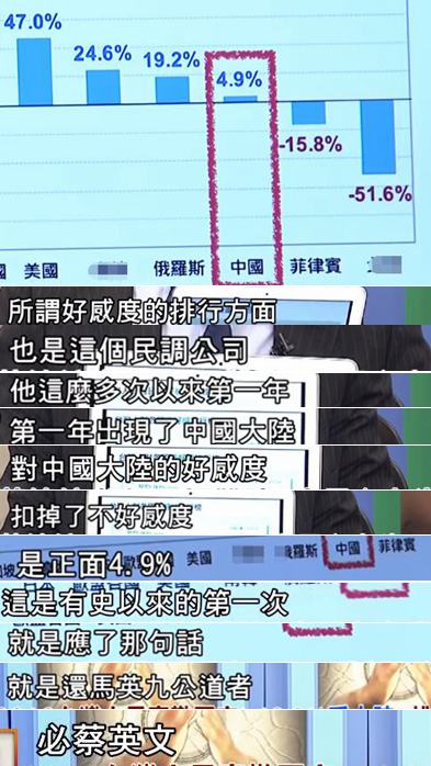 同一份親綠媒體的數(shù)據(jù)顯示,臺(tái)灣民眾對(duì)大陸的好感度“有史以來第一次”出現(xiàn)了正面評(píng)價(jià),政論節(jié)目主持人黃智賢對(duì)此表示,這個(gè)100%親綠民調(diào)能有這樣的結(jié)果絕對(duì)是“來之不易”,黃暐瀚更激動(dòng)地直言,這份好感度的排名也印證了那句話——還馬英九公道者必蔡英文!