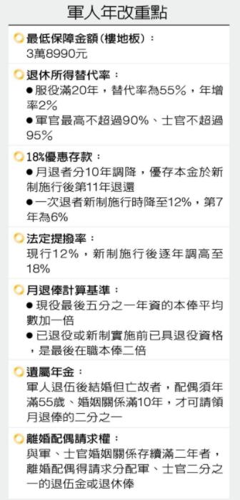 臺(tái)灣公教團(tuán)體的年改去年已經(jīng)完成了,最棘手的軍人年改20日“三讀”通過(guò)后也將在今年7月1日上路,盡管樓地板確定為3萬(wàn)8990元(新臺(tái)幣,下同),但包含所得替代率、18%優(yōu)惠存款等都受到了影響。