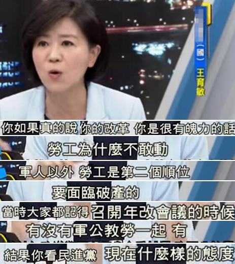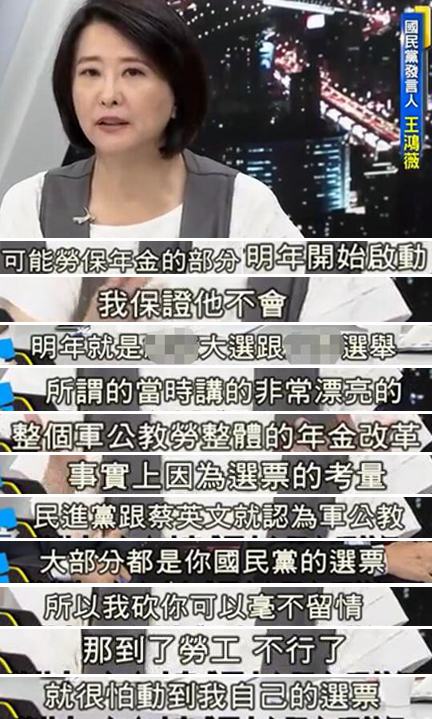 王鴻薇也直言不諱的表示,民進黨和蔡英文認為大部分軍公教都是國民黨的選票,所以砍起年金來毫不留情,但勞工可是民進黨自己的選票,自然不敢輕易動。