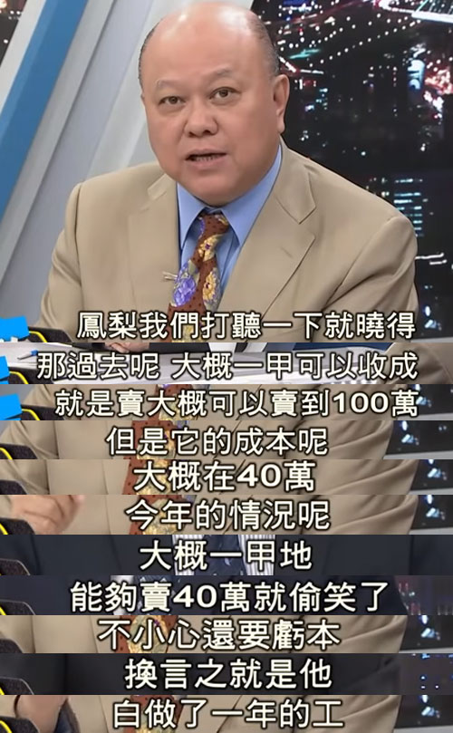 而對于林聰賢的辯駁,李勝峰則給出了一組數據:過去在臺南,農民自整地到種植鳳梨,1甲地(約14.5畝)的收成大概可以賣到100萬,而它的成本在40萬左右,盈利額約為60萬;而以今年的情況來看,1甲地的鳳梨能賣40萬就要偷笑了,一不小心還會虧本,果農們整年的辛苦很可能變成無用功。