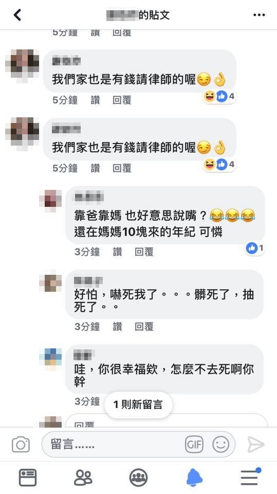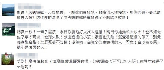 事后,其中一名霸凌女子在臉譜網貼文指出,欠錢還錢,天經地義,今天若是你們遇上,你們也會選擇動手吧,欠6000還6000,我們也沒跟她多收,我們不是錢莊喔,不要因為看到新聞就否定我們,我們平常是乖寶寶好嗎,不要只會出張嘴。貼文引來眾多網友圍剿,可是女子卻反嗆“我們家也是有錢請律師的喔!