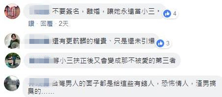 對此,臺灣網友表示:“不要離婚,讓她永遠當小三”“等小三被扶正后又會變成那不被愛的第三者”“臺灣男人的面子都是給這些有錢人、恐怖情人、渣男搞臭的”。