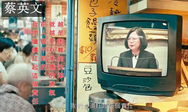 這廣告的內(nèi)容很簡單明了:30秒內(nèi)依序播出了臺灣地區(qū)前領(lǐng)導(dǎo)人陳水扁、馬英九和現(xiàn)任蔡英文對于“年金改革”的發(fā)言,最后以旁白強(qiáng)調(diào)“改革大家都說過,但只有我們(蔡當(dāng)局)真正做到了”!如此對比就凸顯出了“以蔡英文為首的民進(jìn)黨是一個(gè)有承擔(dān)、可信賴的政黨,不會辜負(fù)人民期望”這么個(gè)事兒……