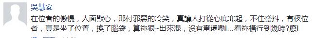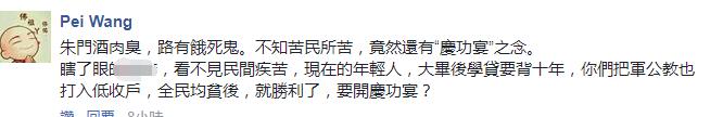 詩人渡也則發(fā)文稱,公敎人員大多是溫良恭儉讓者,而蔡英文、賴神絕對不是!兩個(gè)違規(guī)搶人民財(cái)產(chǎn)者卻大言不慚地表示“我們沒慶祝,很客氣了,不然要怎樣”,難道他們兩位希望退休軍公敎人員向他們致謝道歉嗎?直言這是“得了便宜還賣乖!什么叫欺人太甚?這就是了”。