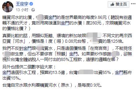 按王定宇的說法,大陸賣給金門的河水,1噸是9.86元(新臺幣,下同),但臺灣的自來水售價1噸9.2元。他質(zhì)疑大陸,明明就是“在商言商”的做生意,卻還敢說是“在照顧金門人”!