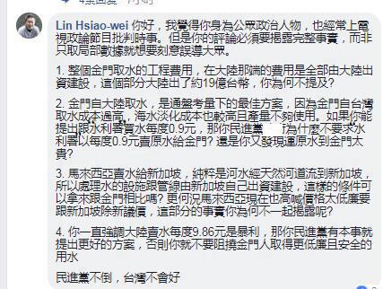 臉譜網(wǎng)“靠北金門”社團就有網(wǎng)友貼出相關(guān)新聞后痛罵王定宇“光講干話”!其表示金門縣政府也曾評估過從高雄送水,1噸成本約280元,若從福建引水到金門,1噸水的成本大約45.5元;但根據(jù)協(xié)議,大陸1噸水僅賣臺灣9.86元,所以“您是要送水給金門人用嗎?光講干話!”