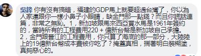 還有不少網(wǎng)友駁斥了王定宇的所謂臺當局為金門通水出資了13.5億的說法,直言“人家大陸出了19億呢,你怎么不講?”而對于“新馬買水”一事,有網(wǎng)友也表示“那是1961年簽的約了”,而且“買水”的條件跟金門根本不一樣好嗎?更有網(wǎng)友諷刺“福建的GDP馬上就要超過臺灣了,你以為人家跟你一樣小鼻子小眼缺金門那點錢”!