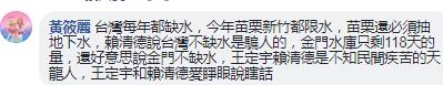 此外,王定宇的“無腦”言論還波及到了賴清德及整個民進黨,“臺灣每年都缺水,但賴清德還說臺灣不缺水呢,騙人的,王定宇和賴清德一樣都愛睜眼說瞎話”、“這就是白癡啊”、“無能又腦殘的冥盡擋政客”!