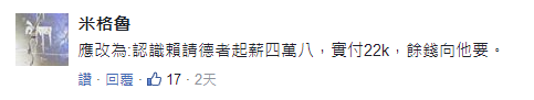 對此,網友們笑說,“擺明跟賴神過不去...哈哈”、“老板都暗示不會給你好薪資了,勞工還在感恩贊嘆這種老板,我也只能笑笑”、“我不認識賴清德,但我認識4萬8”、“我絕對不會跟老板說你的薪水給的太低。”
