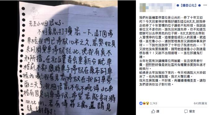此外,她還在“爆怨公社”PO出了張去年該鄰居留下的紙條,留言中“停放十年的車格被停走,不知所措”的論調與當天發生的狀況如出一轍。