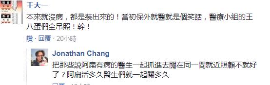而真正為阿扁做出保外就醫診斷證明的醫生也被網友罵是“王八蛋”;