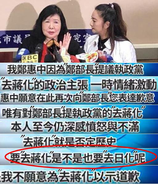 中心思想就是:自己打人這個“行為”不對,向鄭麗君致歉,但“動機”沒毛病,而且特意強調不會為“去蔣化”道歉,并直言“要‘去蔣化’是不是也要‘去日化’?”她認為“去蔣”不是臺灣人民共識,鄭麗君身為“文化部長”卻未傾聽人民意見,推動“去蔣化”是撕裂臺灣人民情感。
