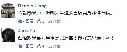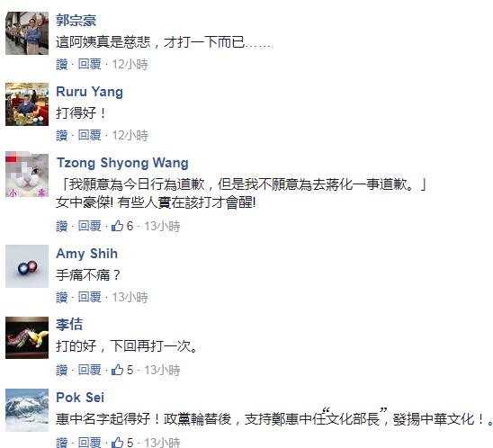 國民黨副主席郝龍斌就在評論此事時直指“這一耳光,官逼民反”!他表示“文化部長”鄭麗君被同樣姓鄭的宗親打了一巴掌想必感到很痛,但更多人因為刨根“去中國化”而錐心之痛、遍體鱗傷;他同時劍指整個民進黨團,稱有人振振有詞、譴責暴力,但民進黨一連串文化刨根洗腦、“去中國化”,數典忘祖,不僅是另一種“不見血的血滴子”,更是“思想上的暴力霸凌”。